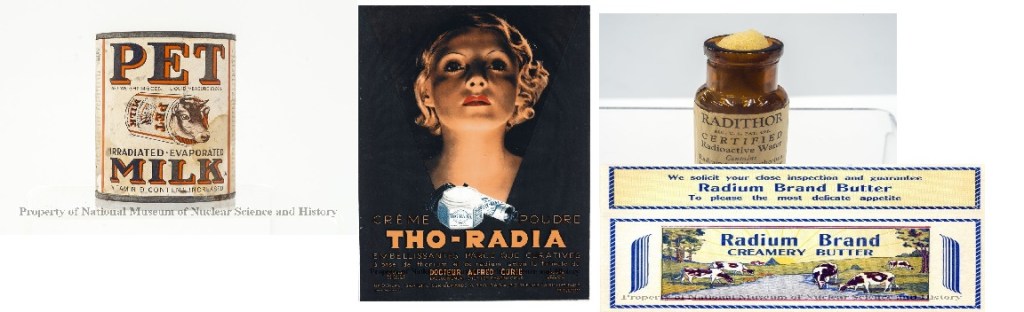 Pero los medios no solo daban difusión a las noticias referidas al nuevo elemento, sino que también lo incluían en su cartelera comercial. Sus misteriosas propiedades captaron el interés del público dando lugar a un rápido crecimiento del comercio que ofrecía de todo. En Alemania se comercializó el chocolate Radium fabricado por Breuk&Braun y el pan Radium de la panadería Hippman-Blach, hechos ambos con agua de radio hasta que dejaron de venderse en 1936. En Francia fue popular la crema Tho-Radia creada en 1932 cuyo anuncio atribuía muy oportunamente su creación a un tal doctor Alfred Curie. En Estados unidos, además del éxito del Radithor se comercializaron otros productos como el Bioray, que era un pisapapeles radiactivo; el Adrenoray, una hebilla radiactiva para el cinturón que reforzaba el vigor sexual masculino, o el Radioencrinator, artefacto con isótopos de radio y con forma de tarjeta de crédito que estaba destinado a introducirse en la ropa interior del hombre y usarse debajo del escroto durante un período prolongado. Ni siquiera España fue ajena a esta fiebre del radio, dónde el agua radiactiva surgía en cada rincón de su geografía convertida, a través de balnearios y aguas embotelladas, en un nuevo producto milagro.